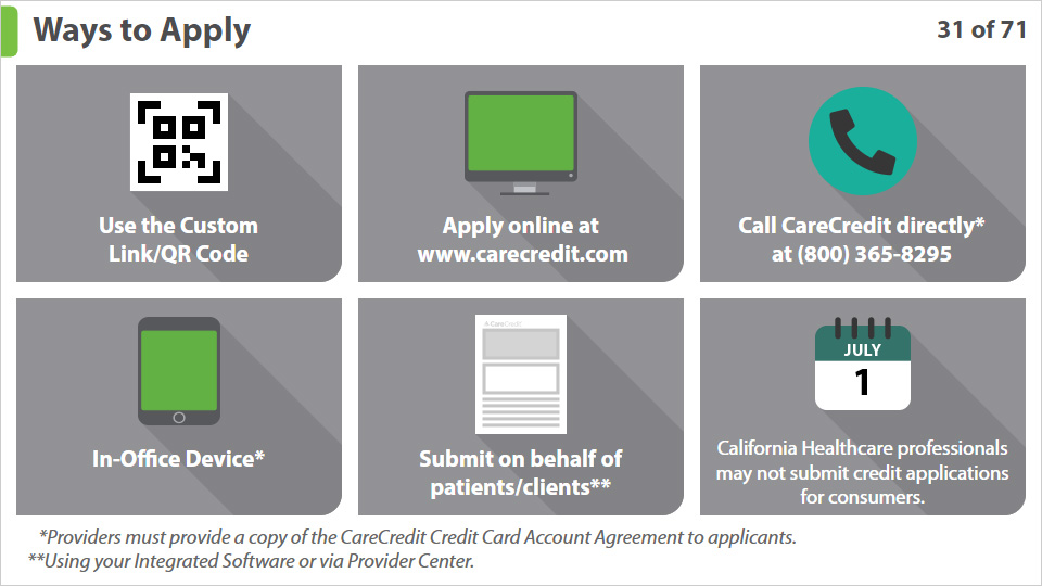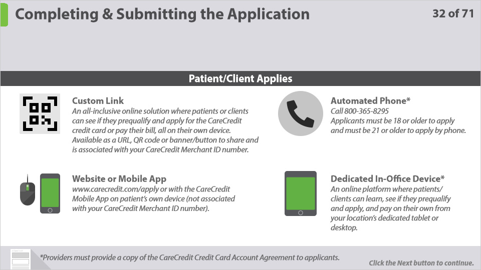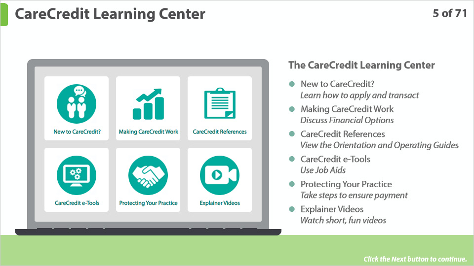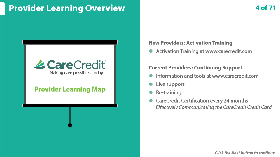 This course was developed to help medical office staff understand how CareCredit works, enabling them to accurately and confidently discuss financing options with patients and clients.
