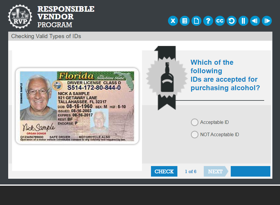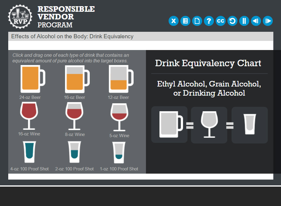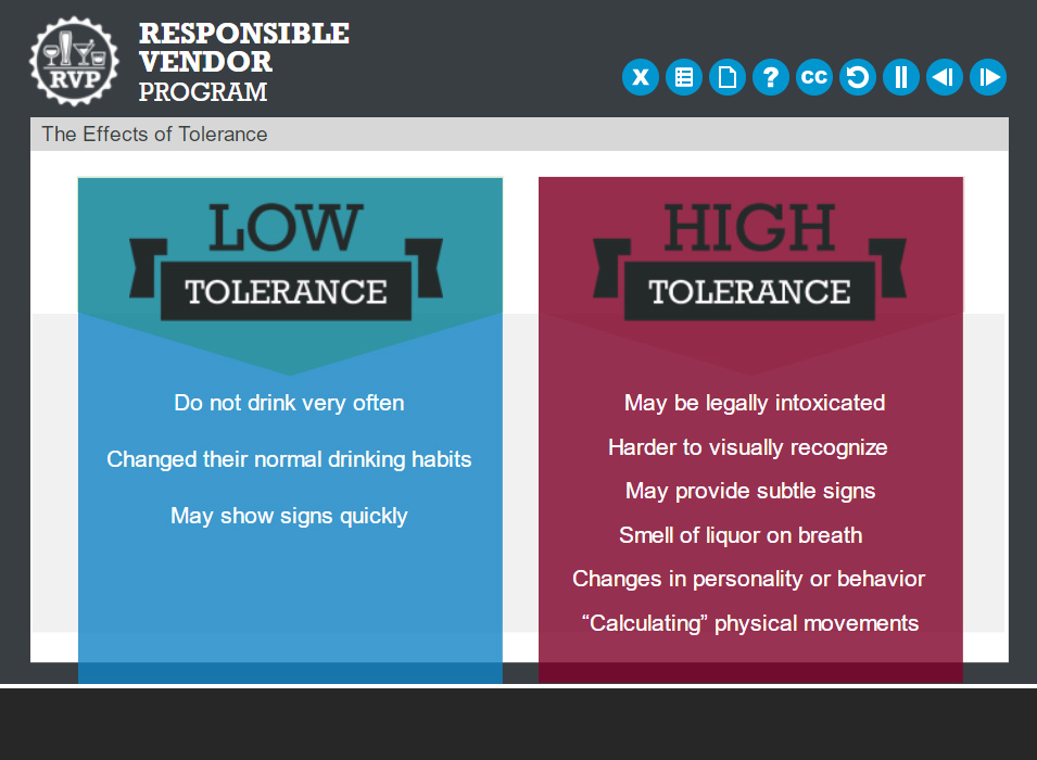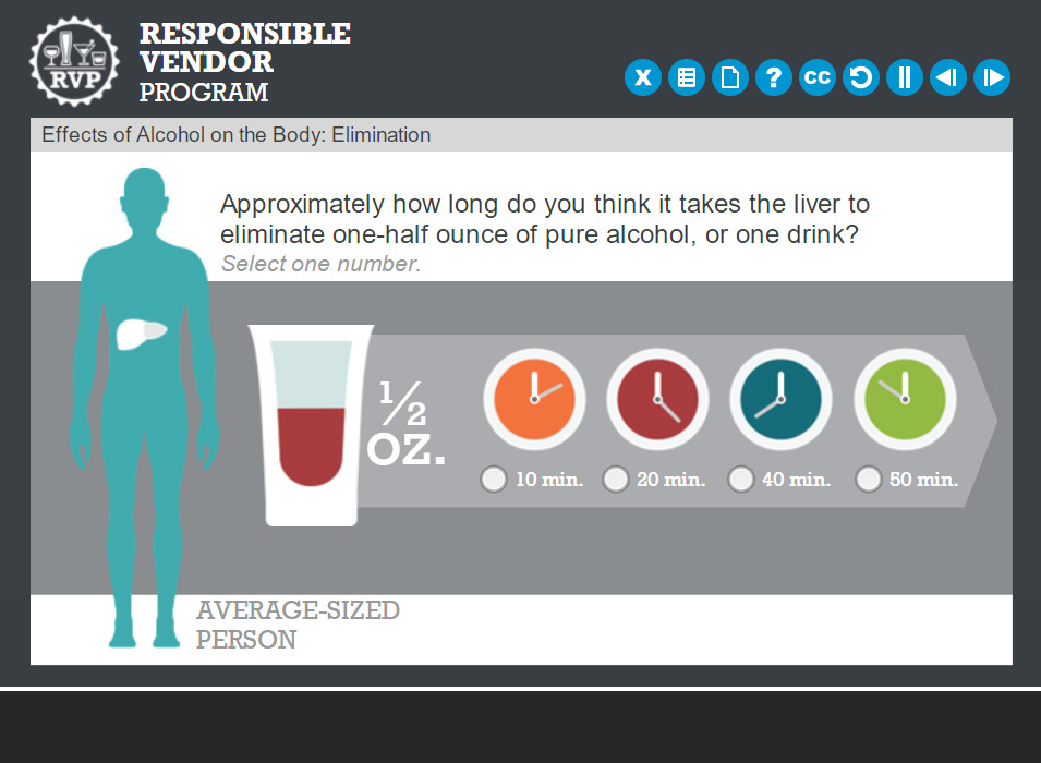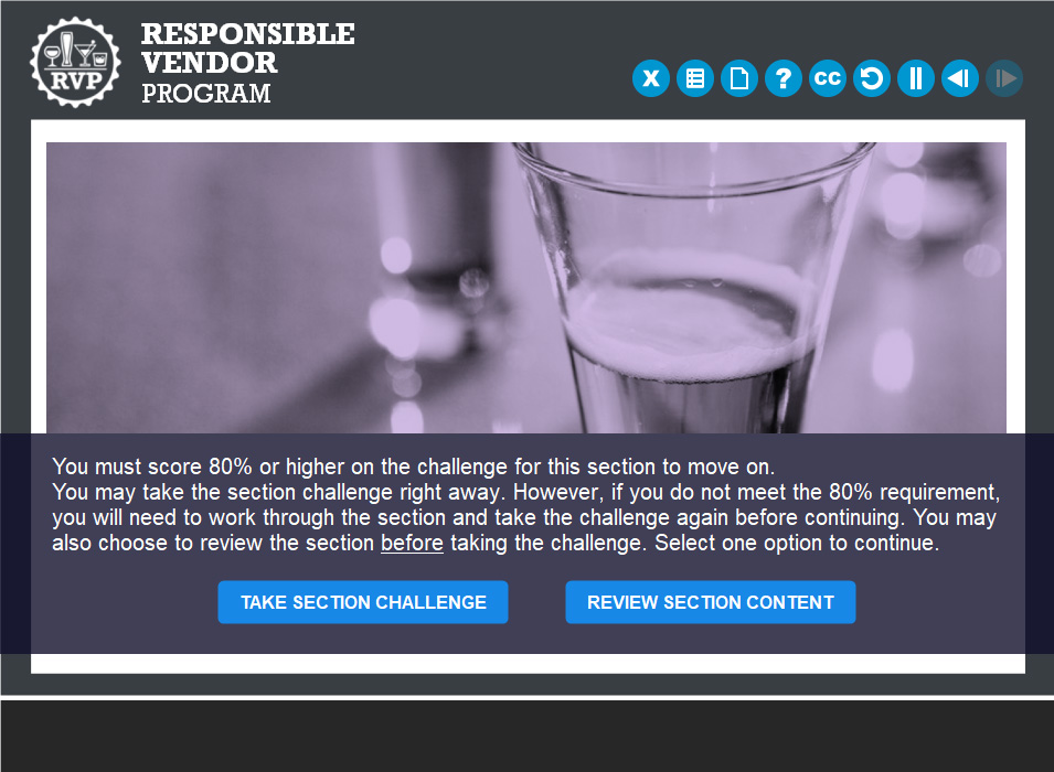 The Responsible Vendor Program Training was created to teach wait staff the legal responsibilities of selling alcohol. The training was designed to be prescriptive, allowing learners to “test-out” by demonstrating their mastery of each lesson.